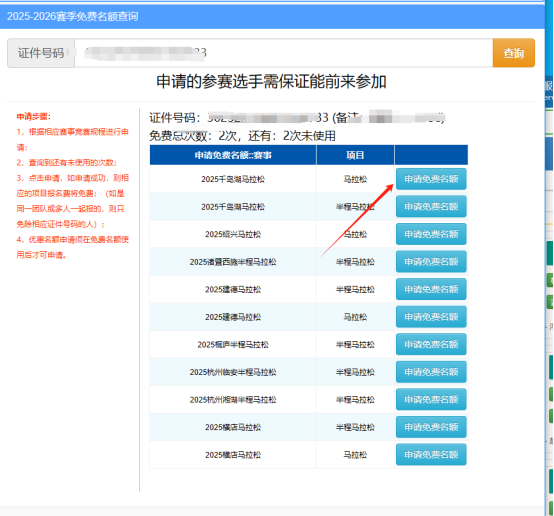 【如有优胜免费名额,则会显示相应次数及本赛季申请记录,在相应赛事后面点击申请,如名额还有,则会提示“申请成功”,如名额已满,会有“名额已满”提示】
