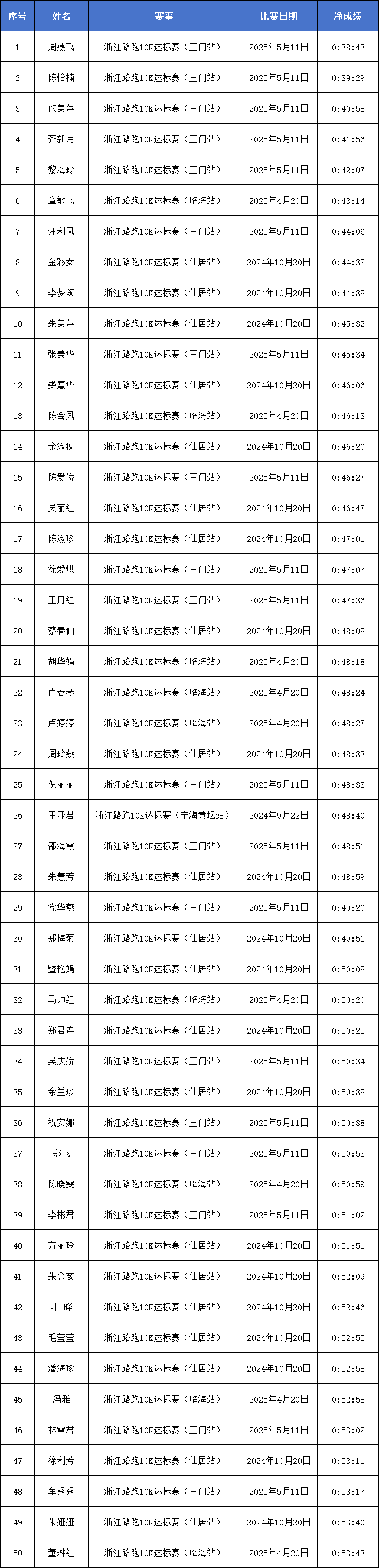 浙江路跑10K达标赛各市男女子前50名名单公示——温州